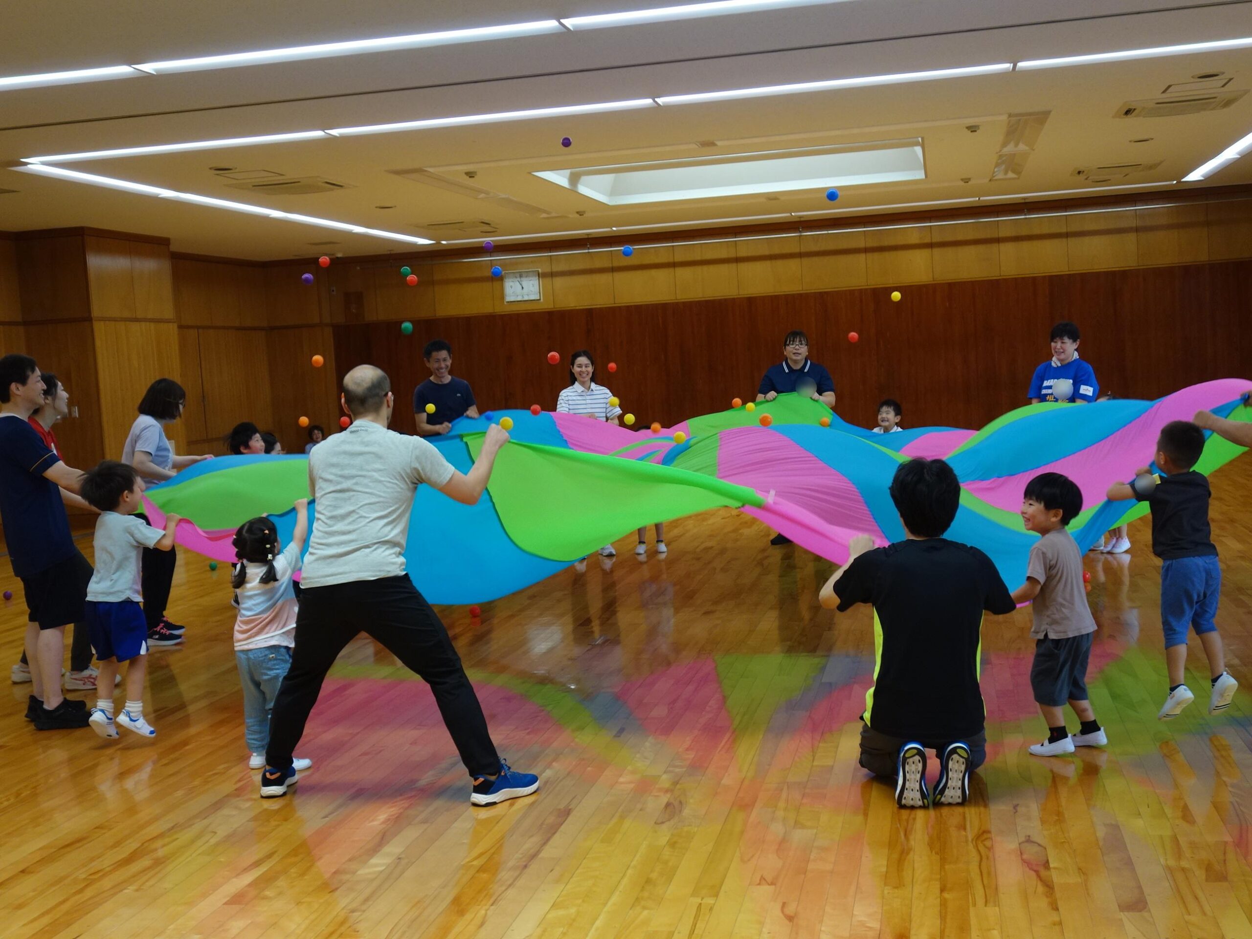 親子の触れ合いを大切にしながら、ボールやロープ、バルーンなどの用具を使って身体を動かします。