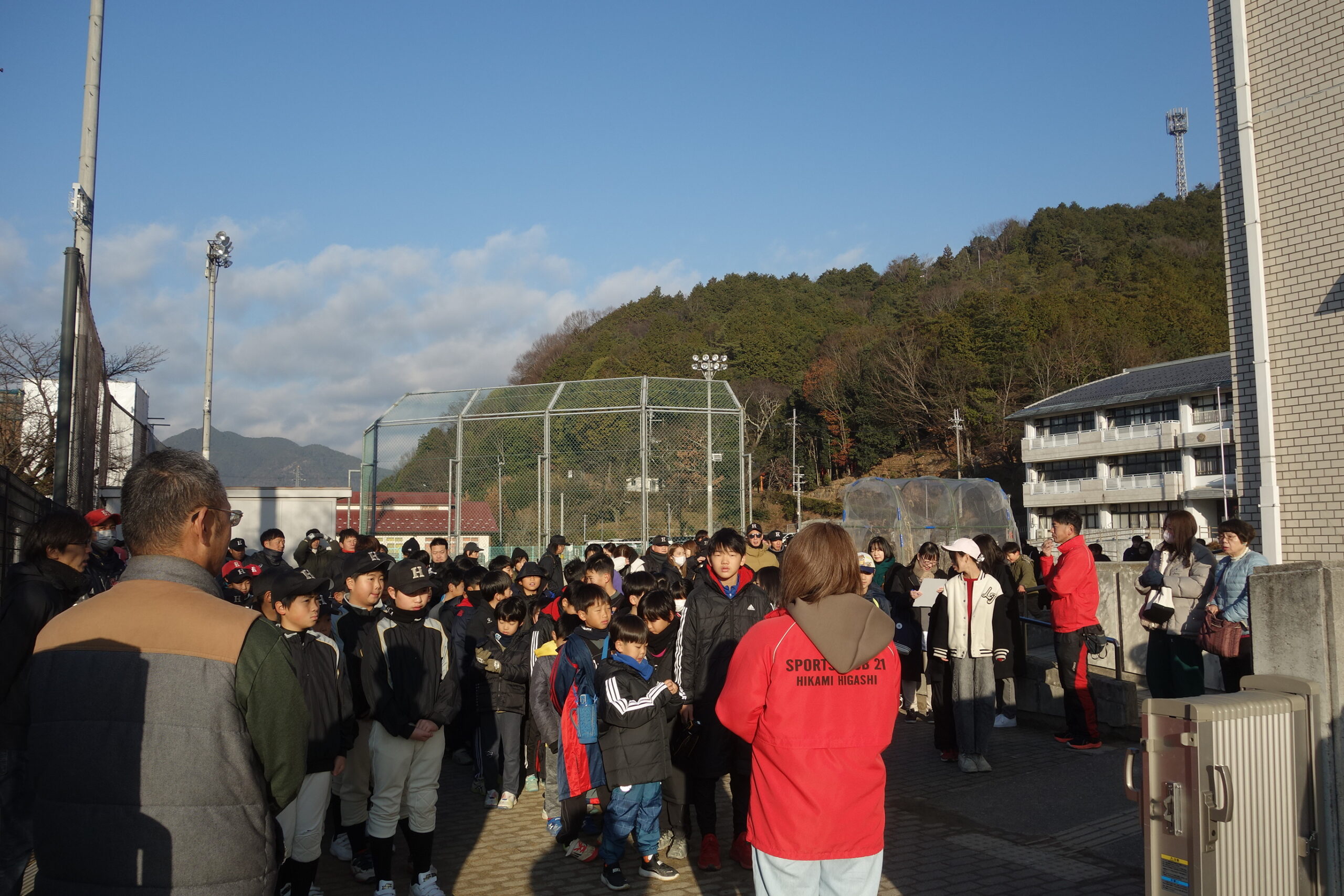 集合場所となった東小学校には164名の参加者が集まり、寒さにも負けない元気な子どもたちの賑やかな声が広がっていました。