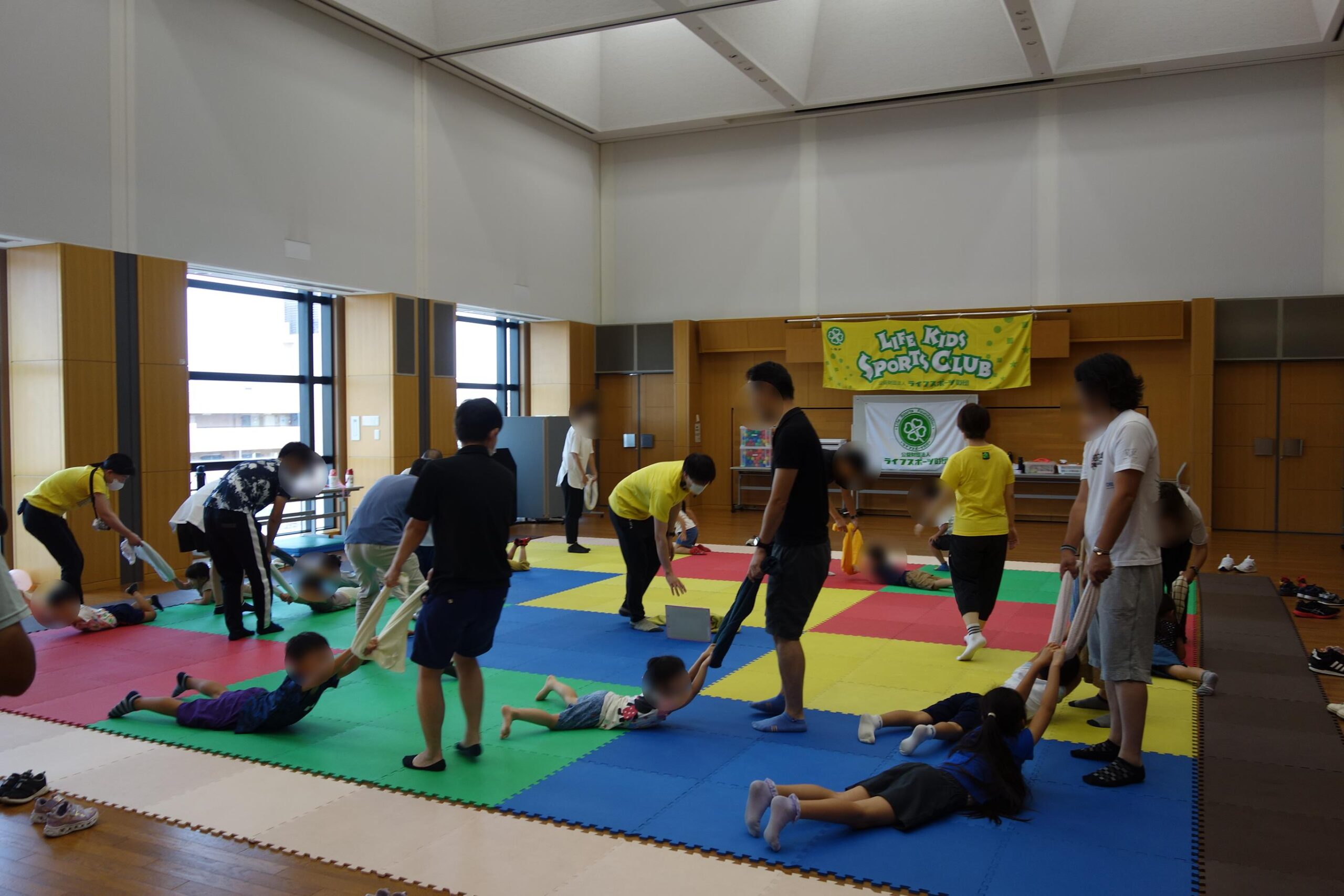 この日は全3回のうち2回目となる活動でしたが、既に始めから会場は暖かい雰囲気に溢れ、子ども達がのびのびとしている様子がとても印象的でした。プログラムは音楽に合わせた楽しい体操や、親子で楽しむタオル遊びなど、おうちに帰ってからも遊べそうな内容が盛りだくさん!