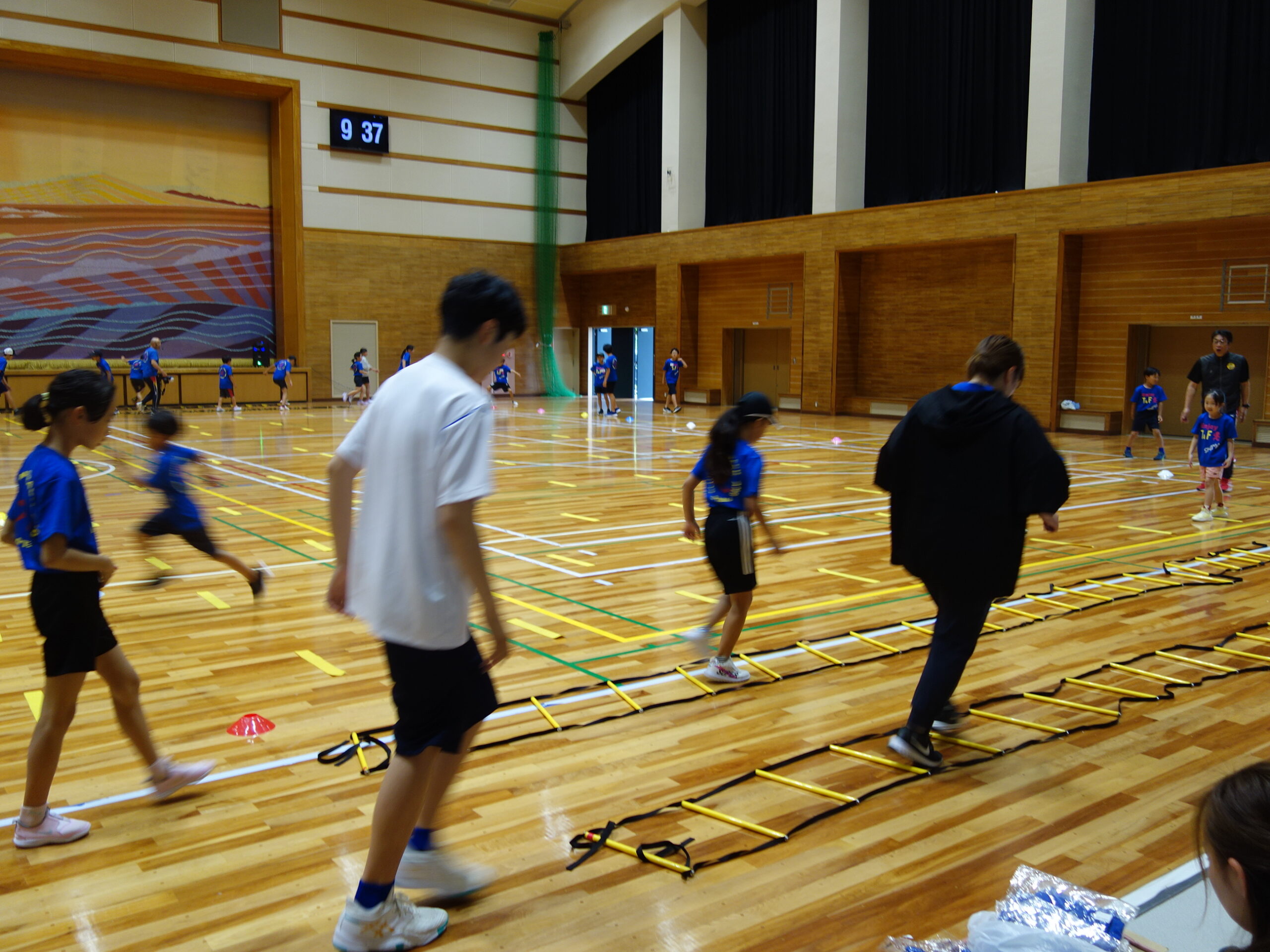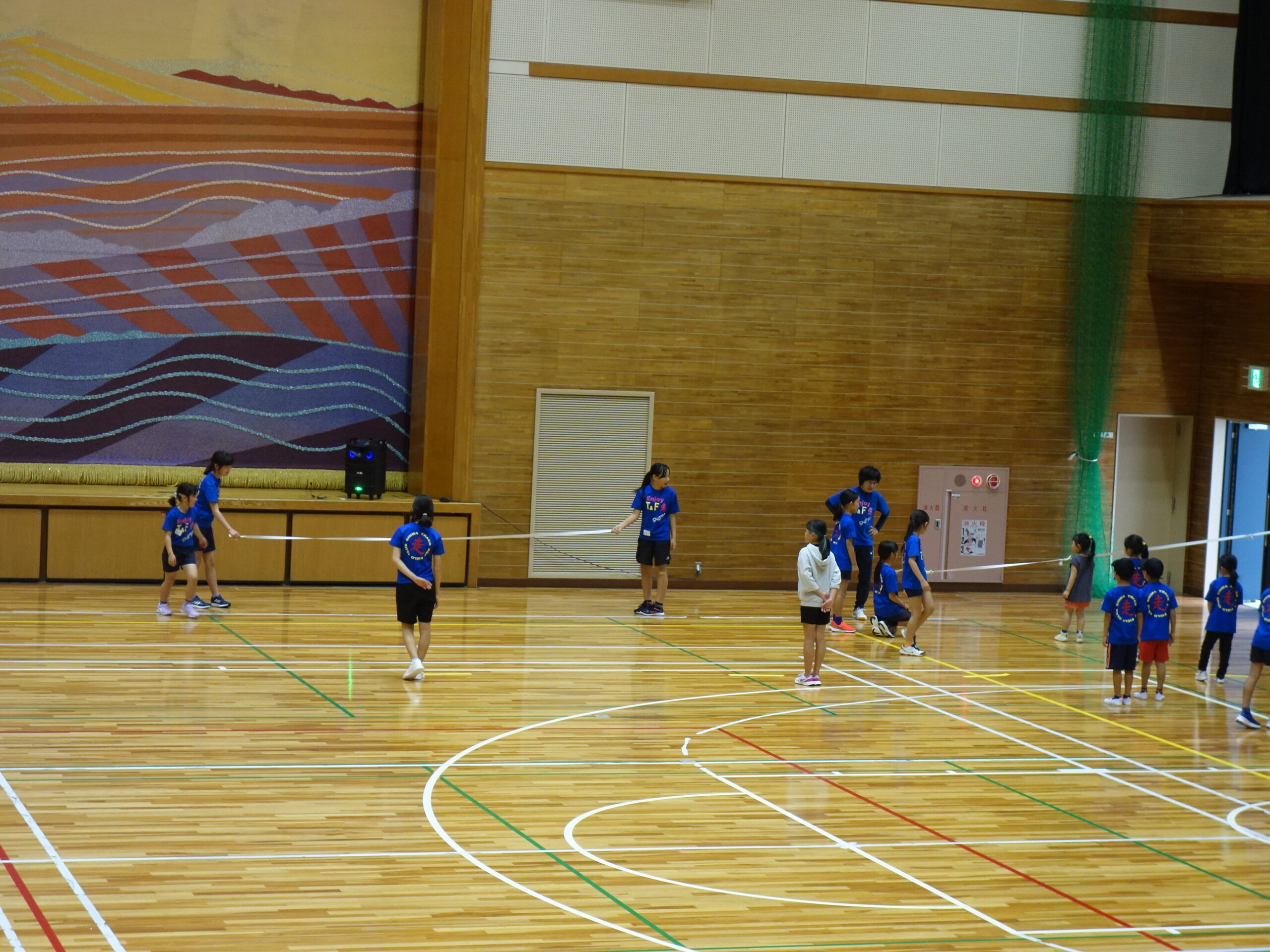 会場の阿児アリーナには109名の参加者が集り、アップテンポなリズムを取り入れた準備運動をおこなった後、投げる・跳ぶ・走るの各テーマに沿って、4つのブースで異なる動作を体験しました。参加者は大人も子どもも、適切な身のこなし方を探求しながら、身体を動かす楽しみを味わっている様子でした。特に、最初はうまくできなかった子ども達が、周りの子や大人の姿を見ながら何度も繰り返すことで、みるみる自然な動きを習得していく姿は特に印象的でした。