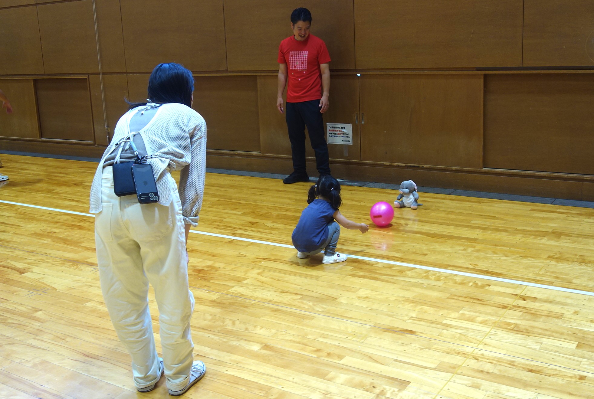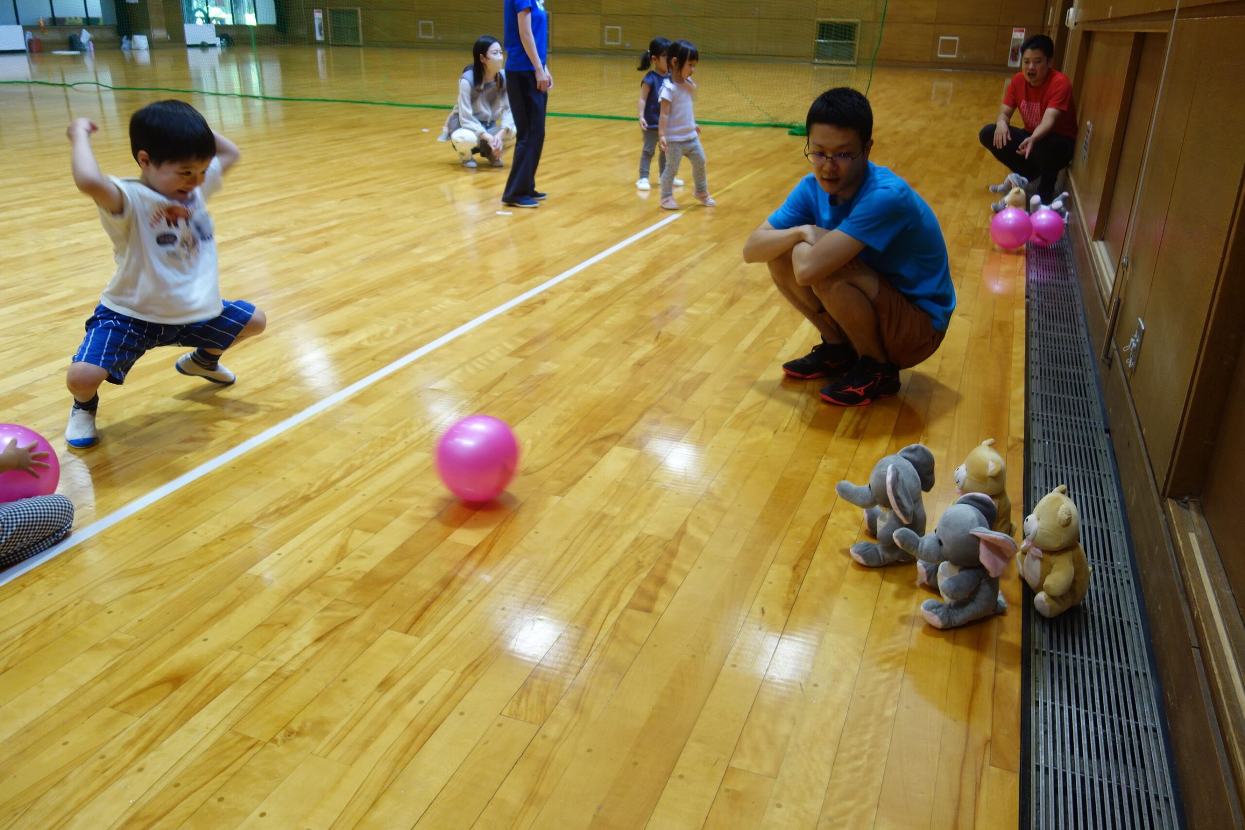 また、転がしドッジボールではスタッフが勢いよく投げたボールをお父さんお母さんと一緒に上手に避けます。