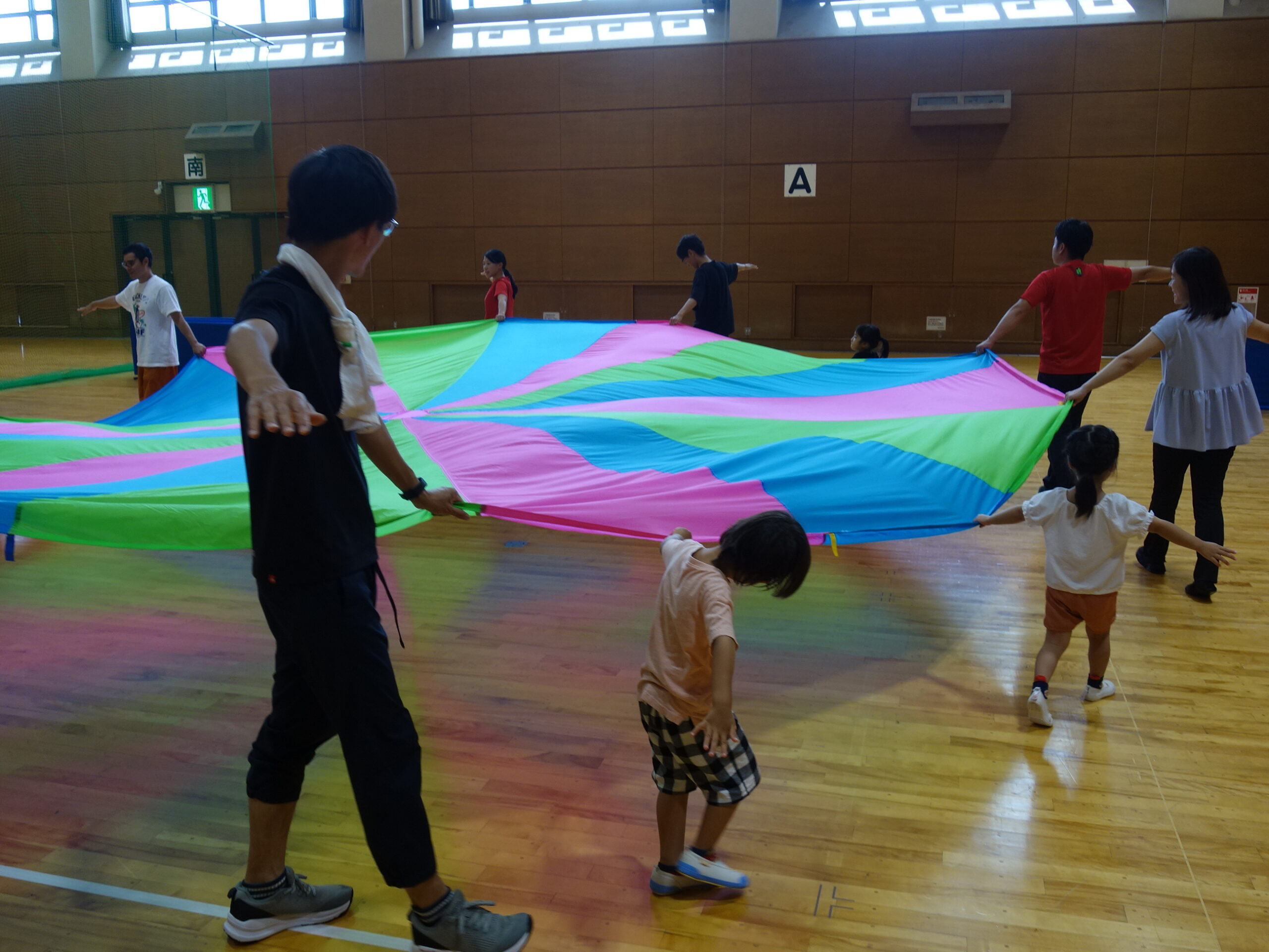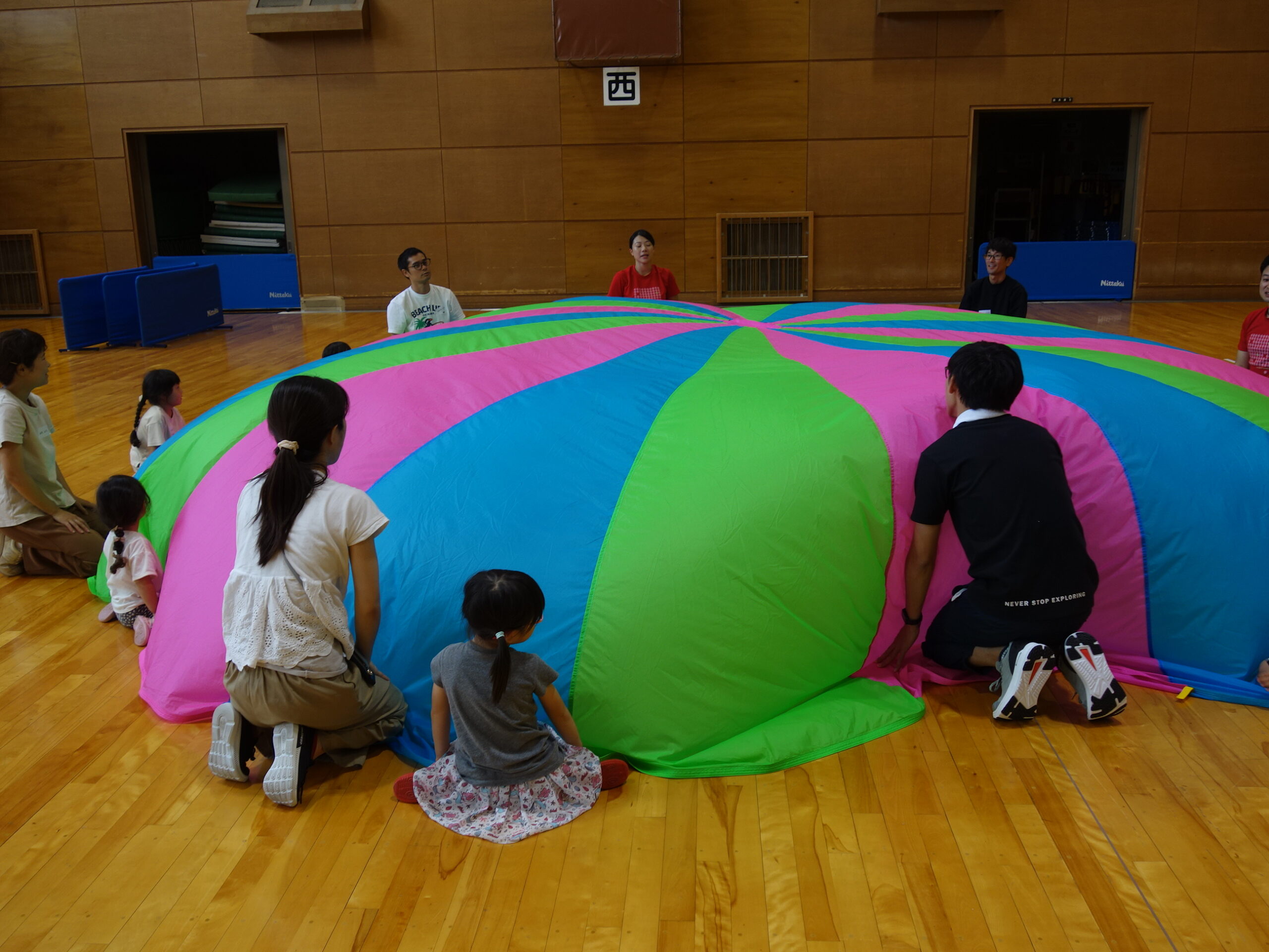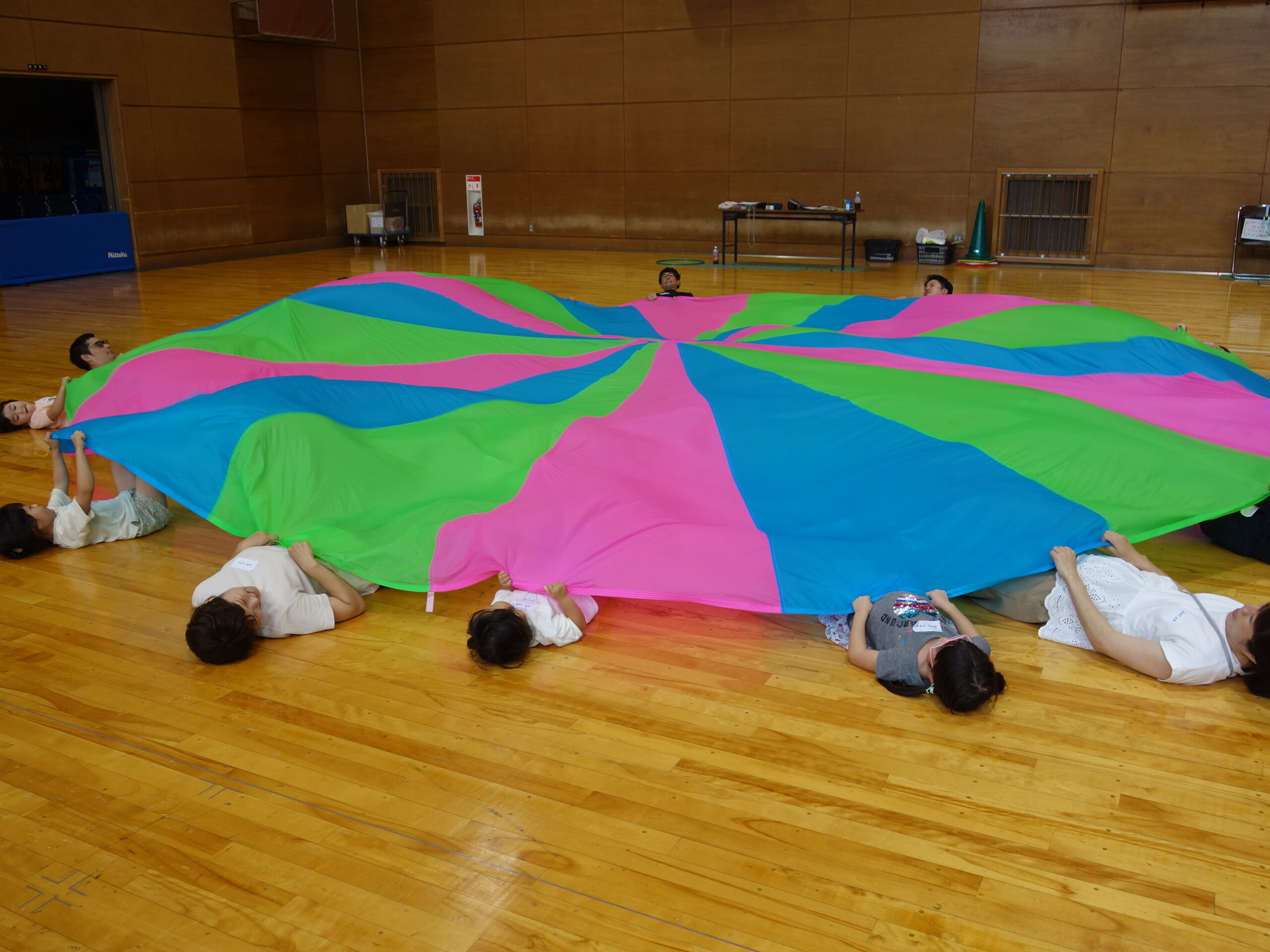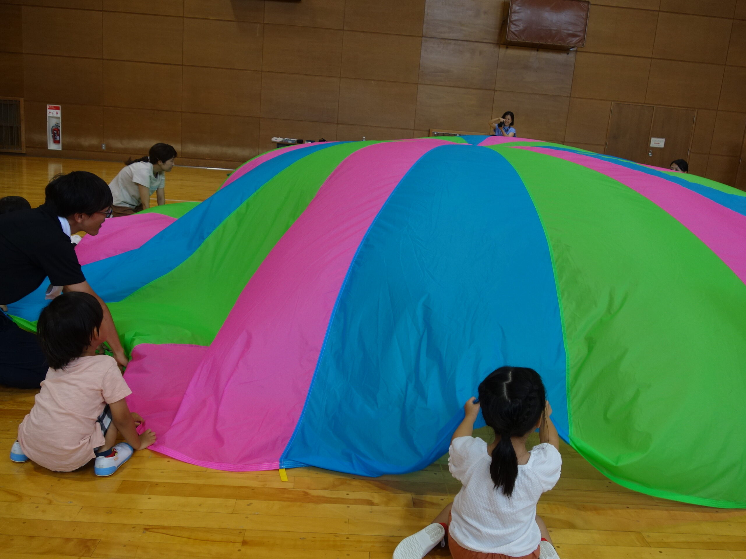 最後に、落ちてくるパラシュートの下を素早く走り抜けるあそびを行いました。お父さんお母さんはパラシュートを持ち上げる役割の為、助けてはくれません。怖がるお友だちもいるかと思っていましたが、スタッフの心配を吹き飛ばすかのように全員がうまく駆け抜け、大盛り上がりで活動を終了しました。