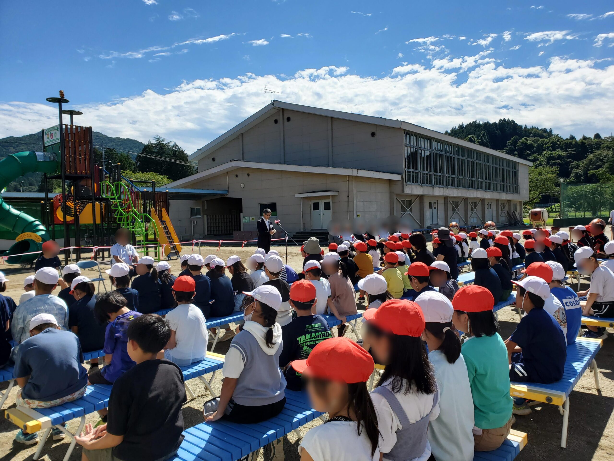 9月4日には遊具お披露目会が行われ、幣財団理事長・清水進の「仲間とともに楽しく遊んでほしい」というメッセージを児童の皆さんに向けてご紹介いただきました。また、メッセージは校内に掲示いただいております。