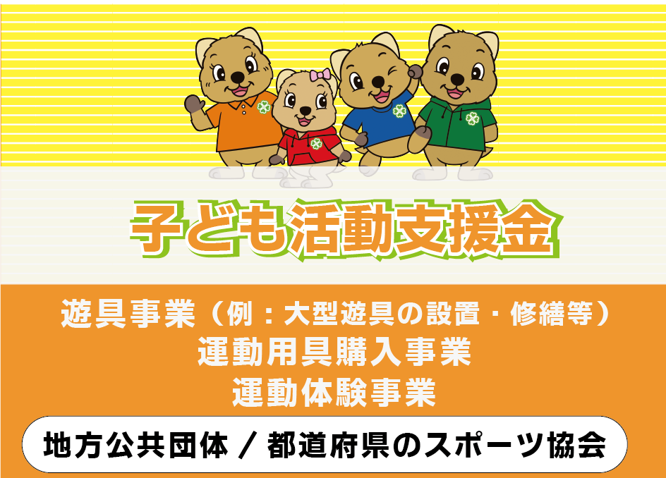 小学生以下の子どもたちが、遊びやスポーツを通して体を動かす機会を広げることを目的に、地方公共団体や都道府県スポーツ協会がその地域で行う取組を支援する制度です。活動に必要な直接経費の一部を助成することで、子どもたちが健やかに成長できる環境づくりを応援します。